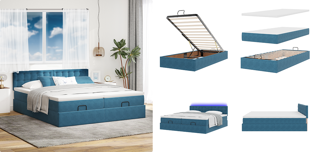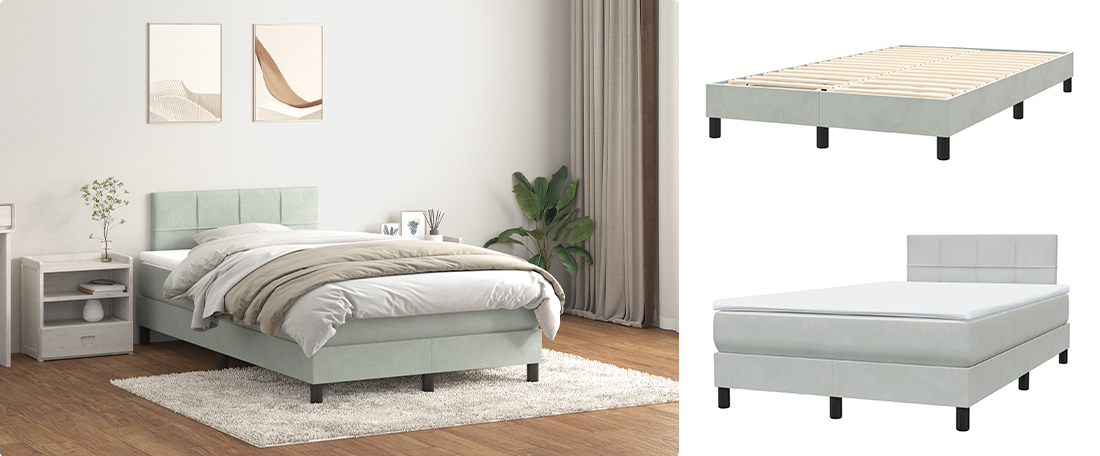 Táto posteľová zostava sa skladá z posteľného rámu, matraca s taštičkovými pružinami a mäkkého vrchného matraca, takže vám poskytne dokonalé pohodlie. Zamatový rám miestnosti dodá útulný nádych, zatiaľ čo taštičkové pružiny poskytujú individuálnu oporu a znižujú prenos pohybu. Lamelový rošt ponúka mimoriadnu priedušnosť, aby bol váš matrac stále svieži. Ide o dokonalú kombináciu „všetko v jednom“, ktorá vám prinesie pokojný spánok.